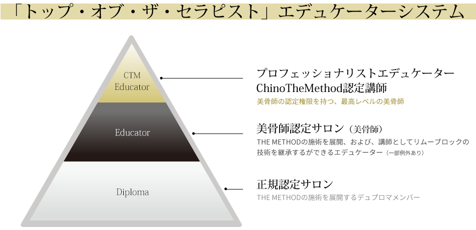 独自の世界観をもつ技術者を生み出す場所として作られた 「Chino THE METHOD」すべてを「手」で作り出す健康的な体。すべてを「手」で作り出す若返り。すべてを「手」で作り出す造形美。オールハンドですべてのエネルギーを 肌、筋肉、骨、血液にまで伝えることで今までになかったエステ技術の芸術を貴方のサロンで。